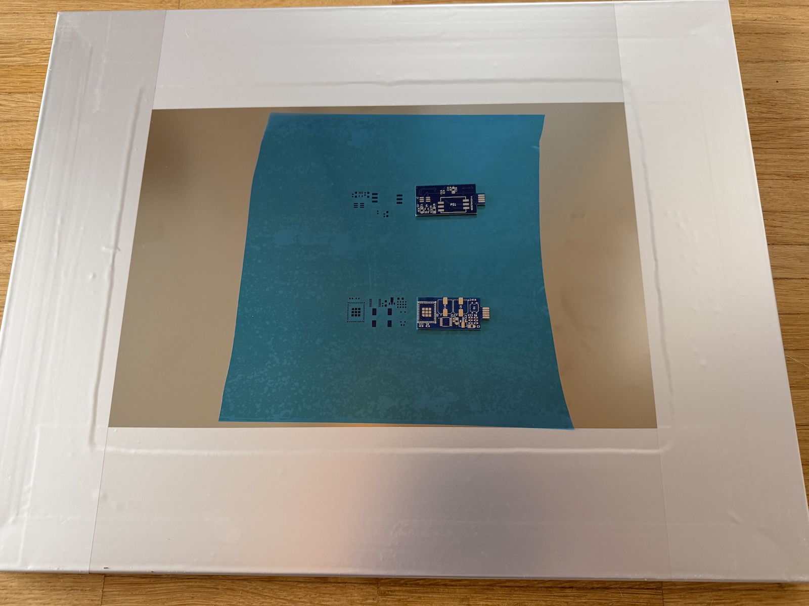 Und sie passen schön fest in die Röhrenadapterplatinen. Nur ein wenig habe ich mich über den überdimensionalen Alurahmen mit aufgeklebter SMD Schablone gewundert (o;